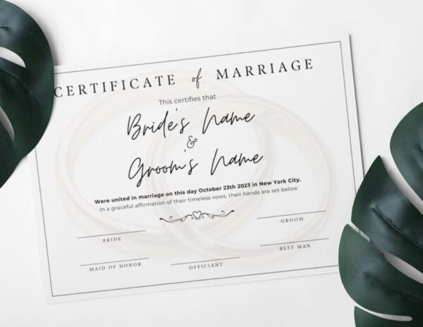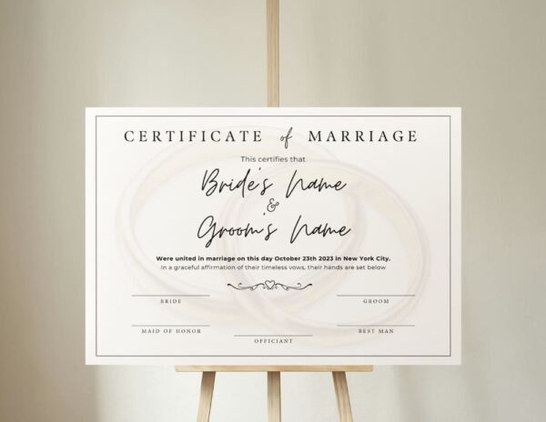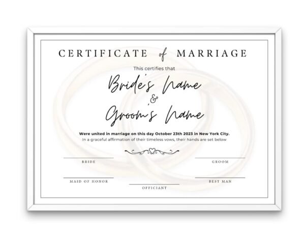 Celebrate your special day with our elegant Certificate of Marriage. This beautifully designed and customizable certificate is perfect for adding a personal touch to your wedding ceremony and reception decor. Instantly downloadable and easy to personalize with your names and wedding date, our certificate is an ideal wedding keepsake that you can frame and cherish forever. Enhance your wedding with this timeless piece.