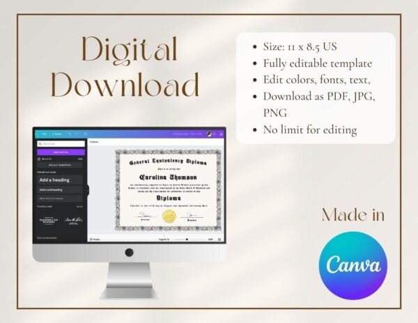 - A fully editable GED Diploma Template, adhering to the standard US size of 11*8.5 inches.